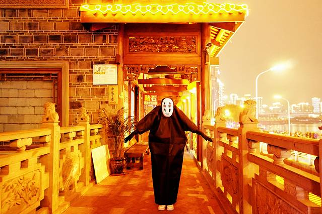 倚着江边,吹着晚风,时不时还有流浪的歌声飘过来。看着灯火通明的洪崖洞,似乎觉得千寻就在眼前一般。除去千寻,其实印象最深的反而是无脸男,大概他是芸芸众生里平凡人的缩影吧,是带着面具的沉默人,会对喜欢的人极力讨好,也曾迷失在欲望漩涡里,好在最后他在千寻的帮助之下,重新找回自我,也有属于自己的朋友了。