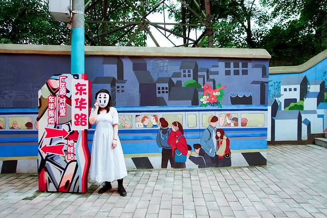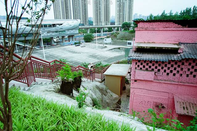 搭乘重庆轻轨1号线抵达石井坡站时,远远便看到对面那立于小山坡之上的彩色房屋,就像屹立着的童话世界般斑斓。