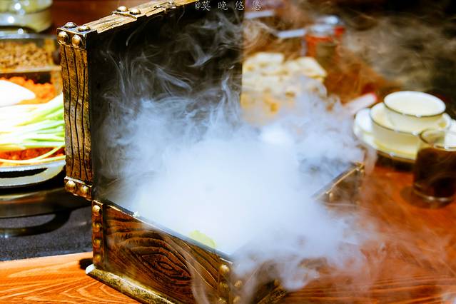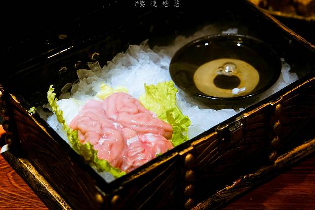 紧接着上菜的月光宝盒脑花,有着干冰的衬托,不断冒着仙气,大概过了几分钟之后才露出脑花的模样,看着有点吓人,涮熟之后口感非常嫩,不愧为招牌菜。