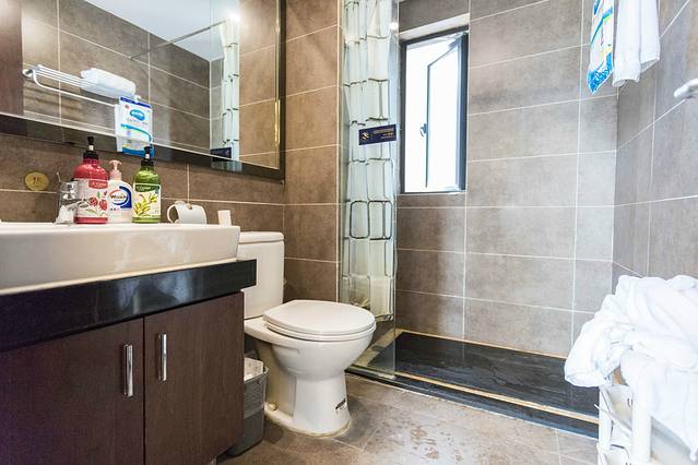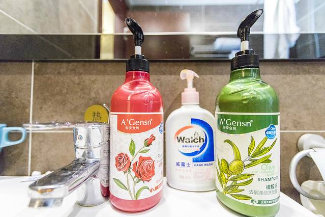 卫生间的灯光明亮,设计也很合理,特别是空间很大给人的感觉比较好。热水来得很快,这种夏天其实洗个舒服的热水澡才是非常需要的享受,地漏无堵塞,地面无积水现象,好评~