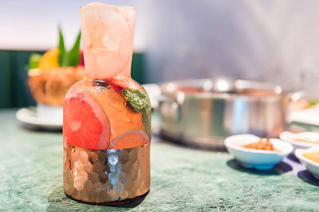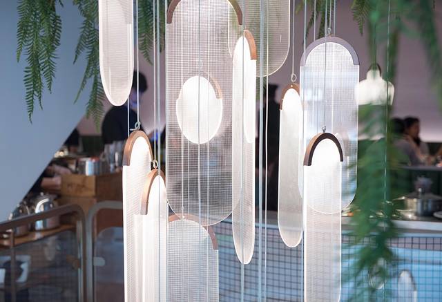 店里总共有两层楼,进门处是餐厅的收银台,旁边一个旋转台阶通到二楼,空中的艺术灯和热带植物超级漂亮,很适合在这里拍点人像照片。室内空间其实非常大,但为了整体美观,并没有摆多少桌子出来,可能这也是为什么随时过来都要排队一两个小时的原因之一吧,毕竟不像其他川味火锅,门外面撑个棚再搭几张桌子就可以马上开始坐。