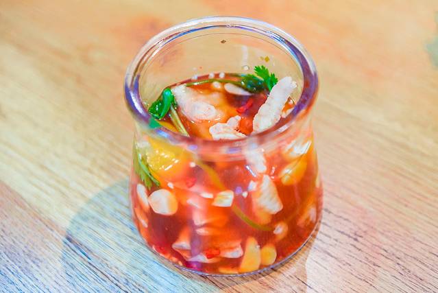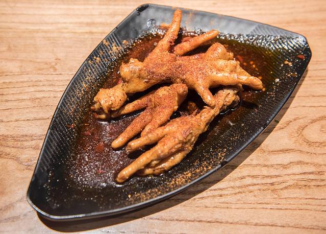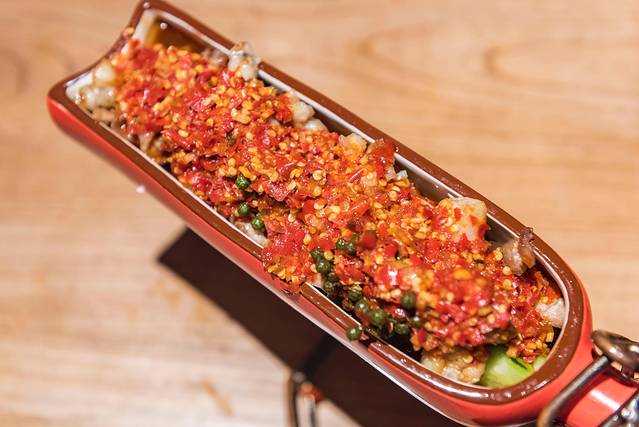 等候的过程中可以点一份秘制泡椒凤爪,这个味道不是很辣,但吃着却超级多爽,上面的肉被泡的很软,轻轻一咬就脱骨了,如果有兴趣挑战一下罐里的这个泡椒也可以,吃了绝对酸爽无比。