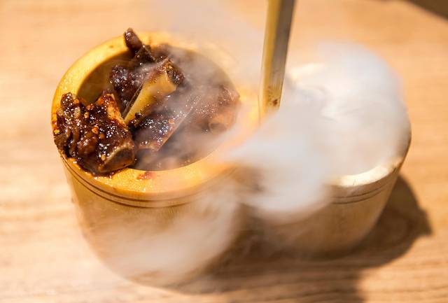 而秘制小排骨不仅是一道美味,也是一个拍照的好菜品,除了独特的酒具造型,端上来这一刻的烟雾环绕,拍照也很好看;排骨肉做得很紧致,一方面比较有嚼劲,另一方面又不会很柴,比较考验厨师手艺。