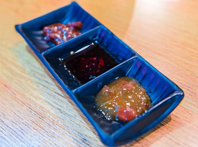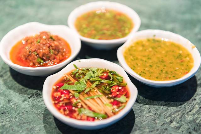 料碟很有特色,除了传统的干碟子之外,还有一个三宫格的酱料,蘸着吃味道比较独特。