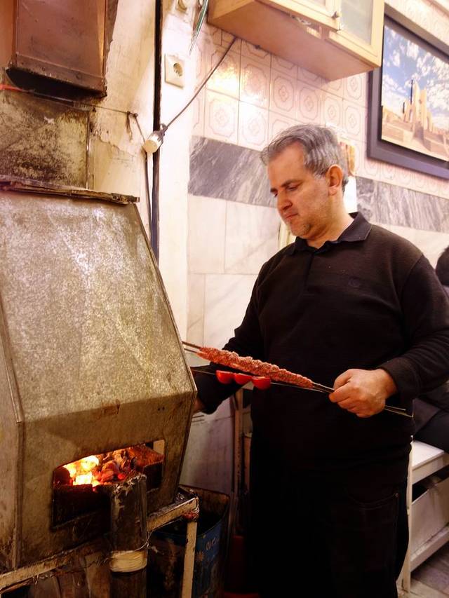 大不里士大巴扎内有一些物美价廉的饮食店,图为厨师正在烤羊肉串。。