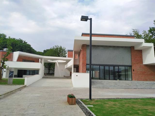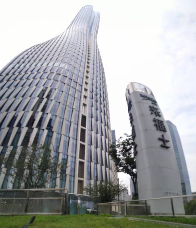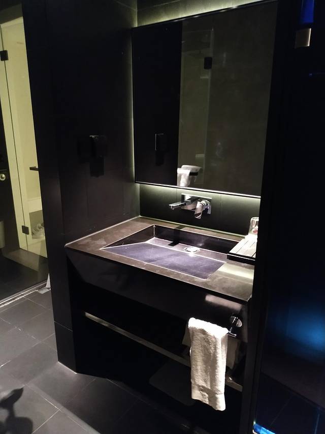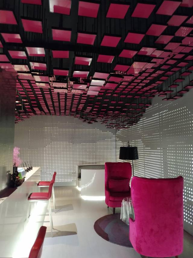 酒店大厅,很有现代感,与室外的园林有鲜明的对比 外表是园林建筑,完美融入西湖景区内, 内在的科技感和现代感恰好激发年轻人的热情