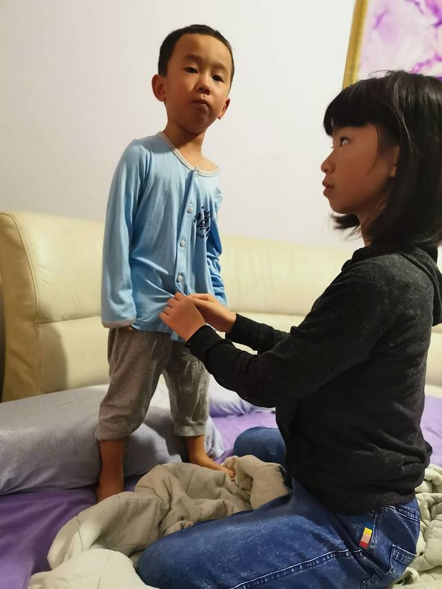 早上5点多就起床了,没有懒床,姐弟相互帮助。