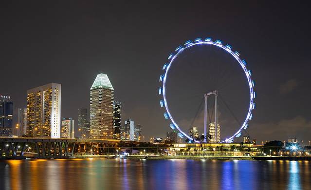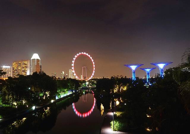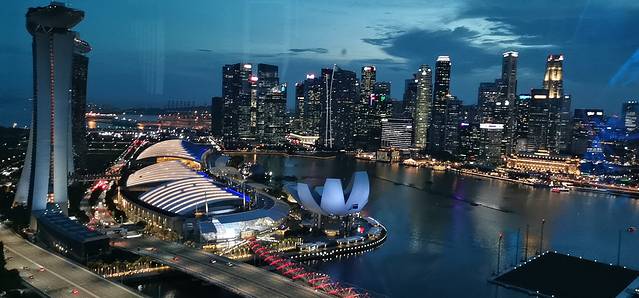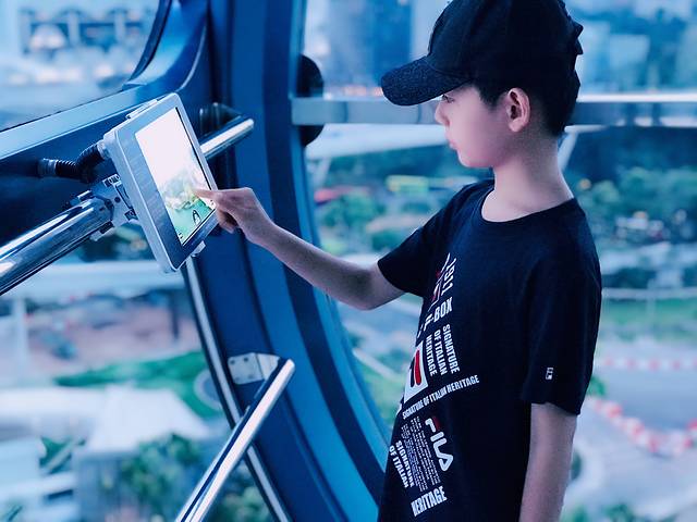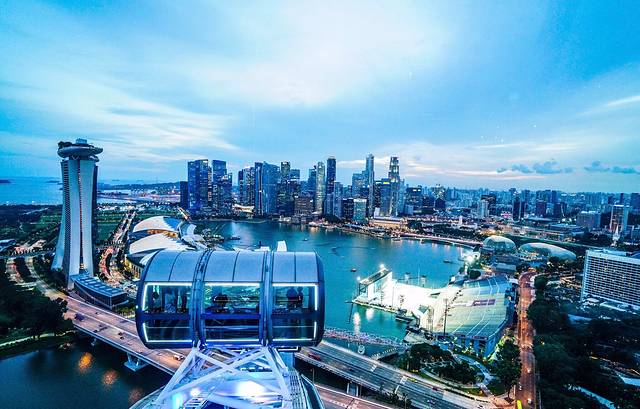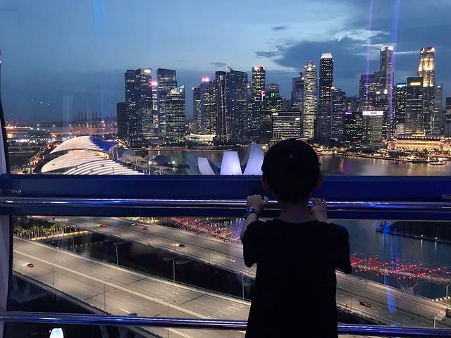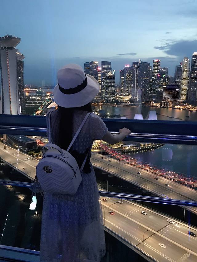 新加坡摩天观景轮又名飞行者摩天轮(Singapore Flyer),高165米相当于42层楼高,比英国伦敦的“千禧眼”还要高30米,每舱可坐28人,将新加坡美丽的滨海湾、高耸的摩天大楼40分钟之内尽收眼底,甚至马来西亚及印度尼西亚部分岛屿的大好风光亦可收入眼帘。我们是傍晚上的摩天轮,时间点选择的非常好,感受了新加坡天黑前后两种景色。