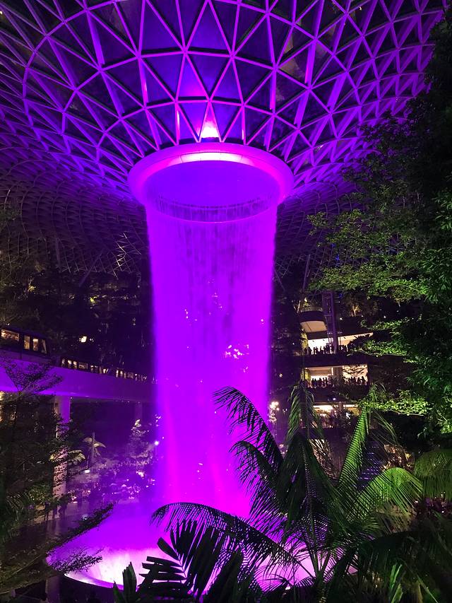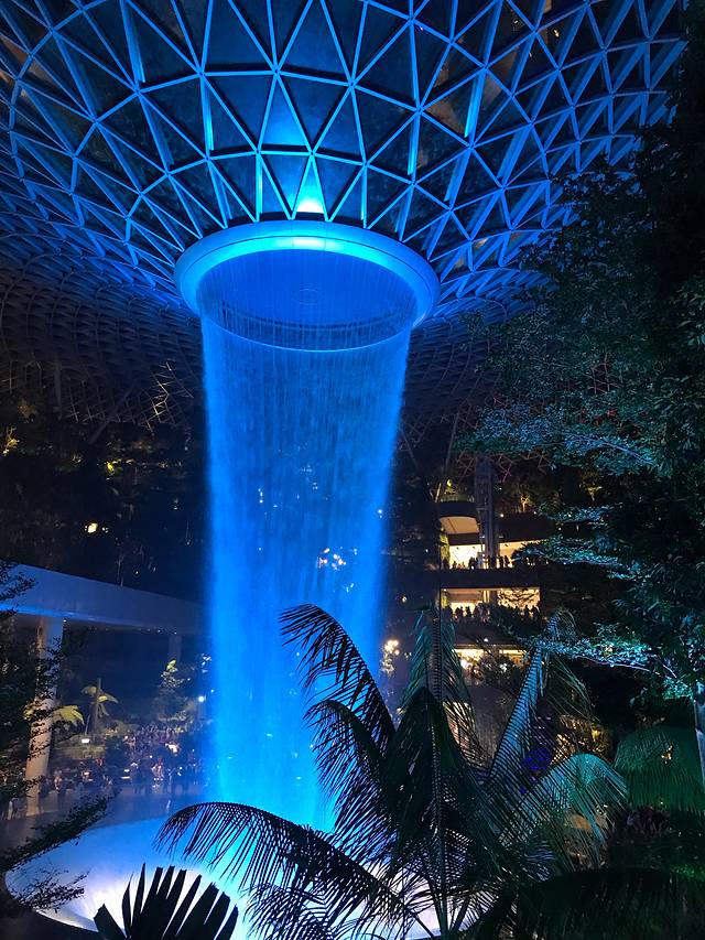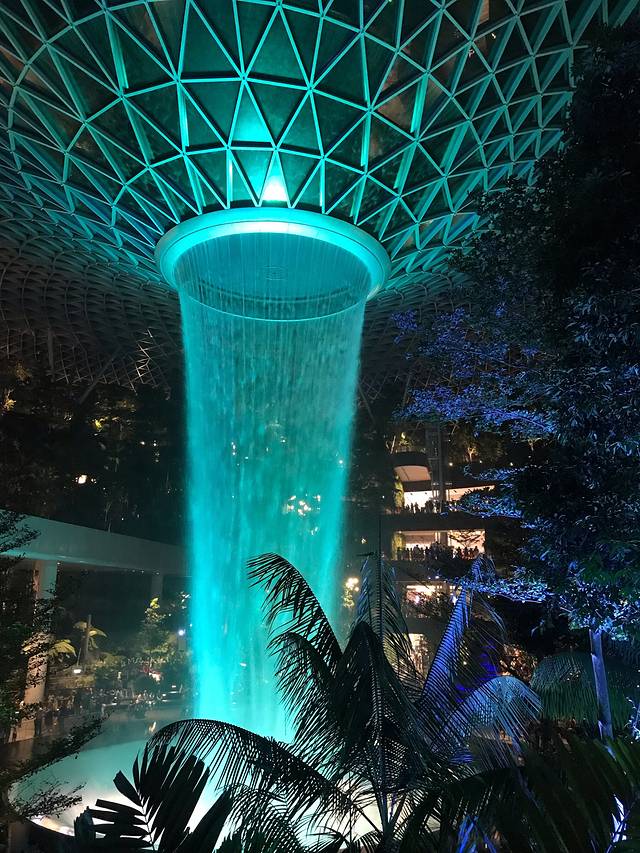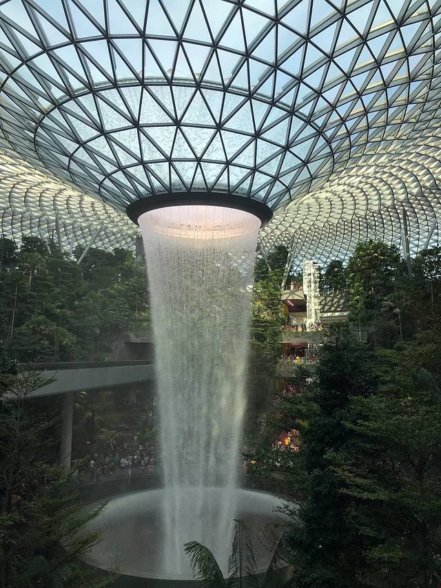 “雨漩涡”这是迄今为止在世界上最高的室内瀑布,高达40米的它无疑是“星耀樟宜”的一大亮点,在白天,雨漩涡使人沉浸在日光下的水雾中,夜幕降临时,瀑布中的层层水幕将会变成屏幕,成为瀑布声光秀~