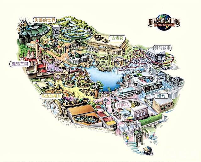 新加坡环球影城共分为七大主题区,分别是:好莱坞、纽约、科幻城市、古埃及、失落的世界、遥远王国、马达加斯加。环球影城24个景点和双轨过山车等项目中有18个专为新加坡设计,全球独有的游乐项目包括以科幻影集太空堡垒(Battlestar Galactica)为蓝本,高度达42.5米的双轨过山车,以及拥有3500个观众席、全球最多座位的未来水世界剧场等各种游乐项目。