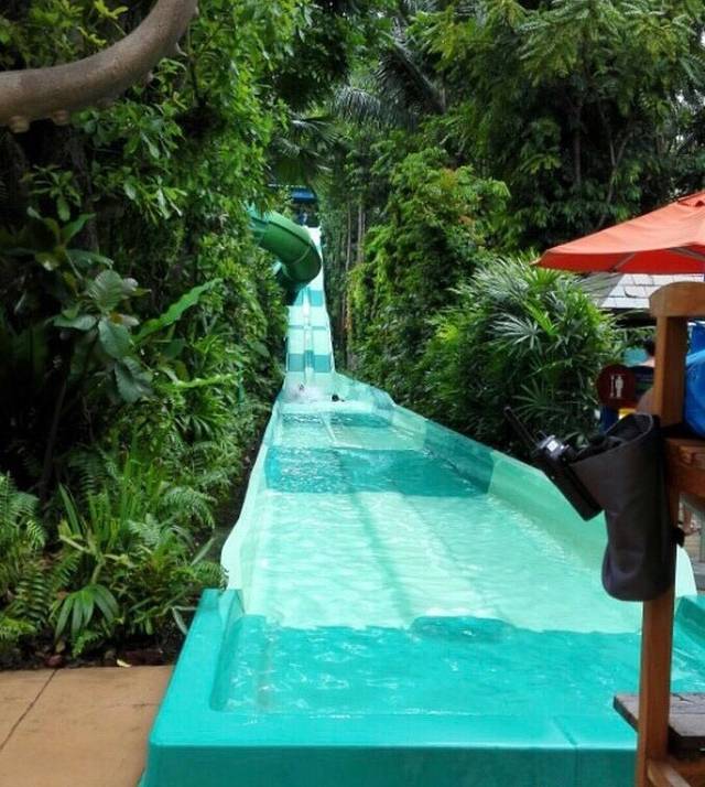 喷射滑道,也就是水流磁力过山车,是园内最好玩的一个项目,也是整个乐园排队最久的项目。乘上这台超高速水上过山车,在离心状态中飞升急坠,忽而回旋,忽而翻转,超级刺激!因为速度太快,脖子一直处于后仰状态,第二天感觉跟睡落枕了一样。其余几个大型项目不算刺激但可以享受到滑行的极速。