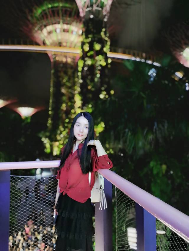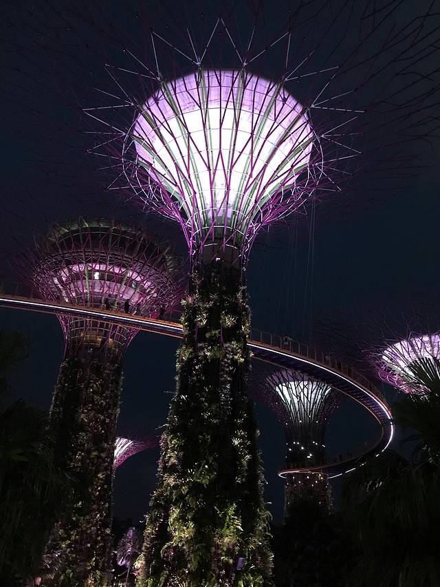 花园狂想曲一晚有两场,7:45和8:45,每场持续15分钟。灯光秀推荐的观赏地点有2个,1个是金沙酒店背后的天桥末端,优点是天桥和天空树差不多在齐平的高度,可以纵览整个灯光秀的全貌。另1个就是在天空树公园里面,躺在天空树下面近距离的观看。我们选择的是在公园近距离观看。表演时间一到,这些天空树便随着音乐变换灯光、调换颜色,坐在草地上,欣赏着这些参天的大树合着美妙的音乐绽放出绚烂的色彩,让人仿佛置身阿凡达的奇幻森林~~