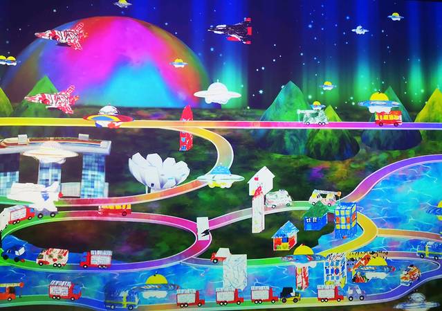 这是孩子最喜欢的一个互动馆,可以用场馆提供的蜡笔在画纸(有汽车、房子、飞机、飞碟等形状)上填色,画出自己喜欢的颜色和图案,然后通过扫描,画的2D的小汽车、飞碟、小房子就会转变为3D的在大屏幕上行走。还可以把你画的小汽车的纸张直接放在屏幕上,纸张会变成透明的,你的小汽车还会挡住开过来的小汽车,非常有趣。很多大人也玩得不亦乐乎!