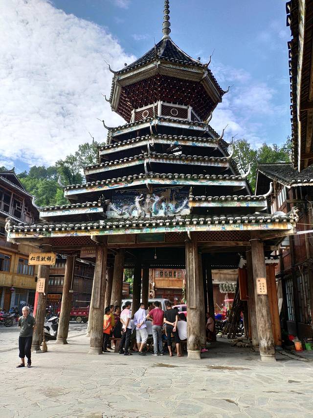 肇兴侗寨有五座鼓楼,分别叫“仁、义、礼、智、信”,鼓楼形似宝塔,下半部分是中空,类似一个遮阳挡风的凉亭,平时侗族人们就在里面聚会休闲。