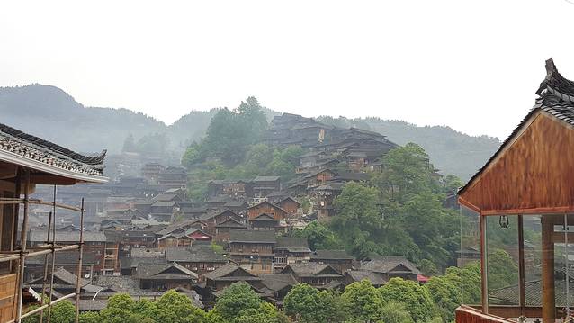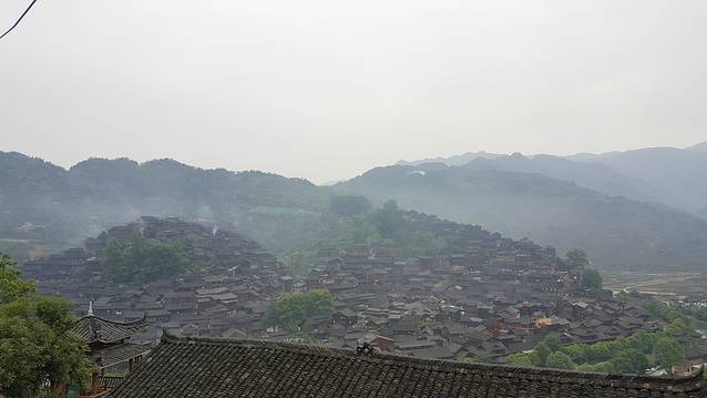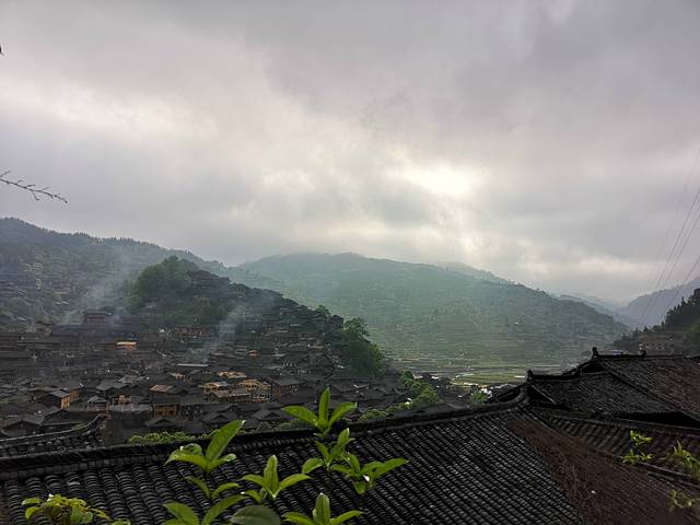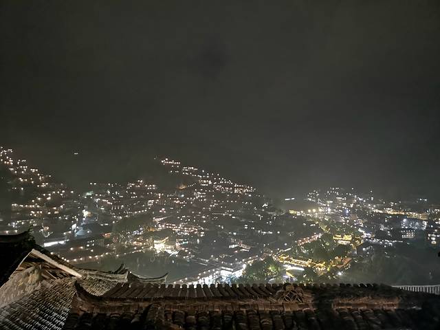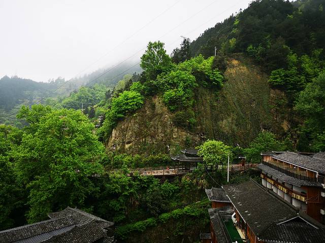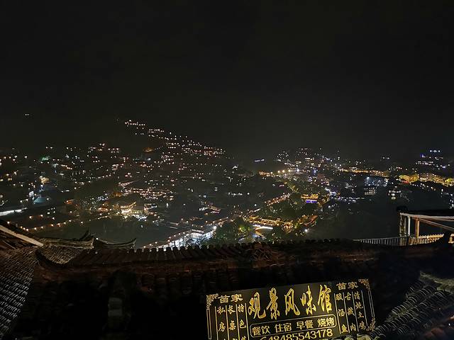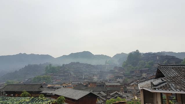 观景台夜幕中感受千百盏灯火从木质吊脚楼的屋檐下亮起,勾勒出整个苗寨的轮廓,是一个牛头的形状。清晨再次来到观景台,薄雾笼罩着苗寨。