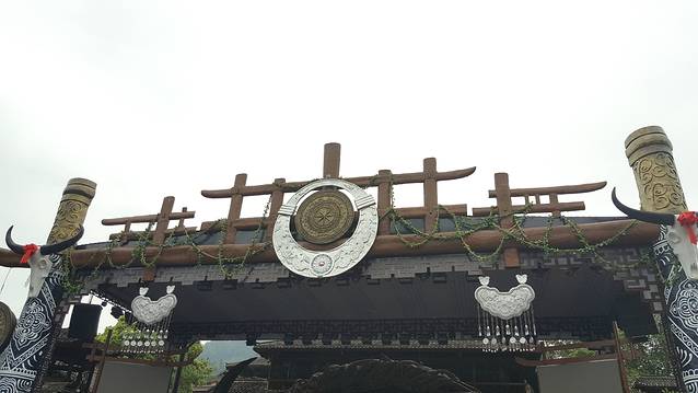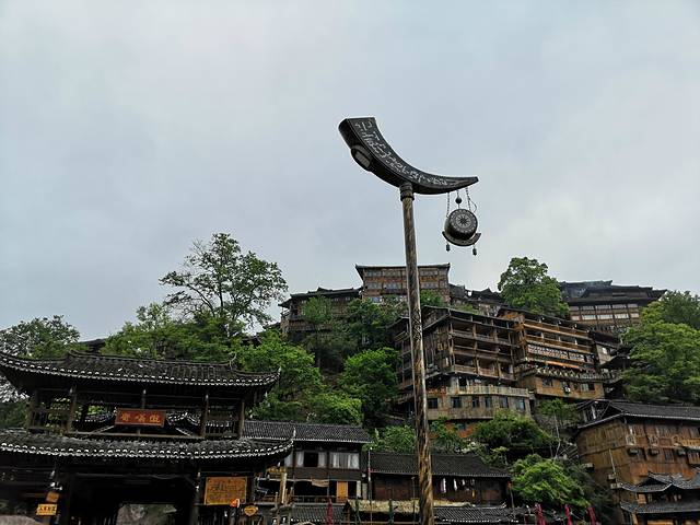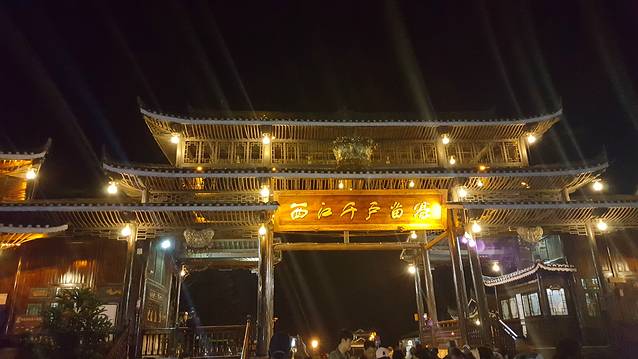 到达西江千户苗寨,停车场下来看到挂有“西江千户苗寨”牌匾的大门,从这扇大门到寨子还有1.5公里的路,可以坐电瓶车,也可以走路。过了这1.5公里,又看见一座和停车场那长得差不多的挂有“西江千户苗寨”牌匾的大门,这才算真正抵达寨子了。