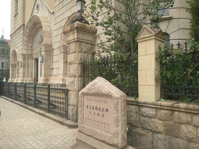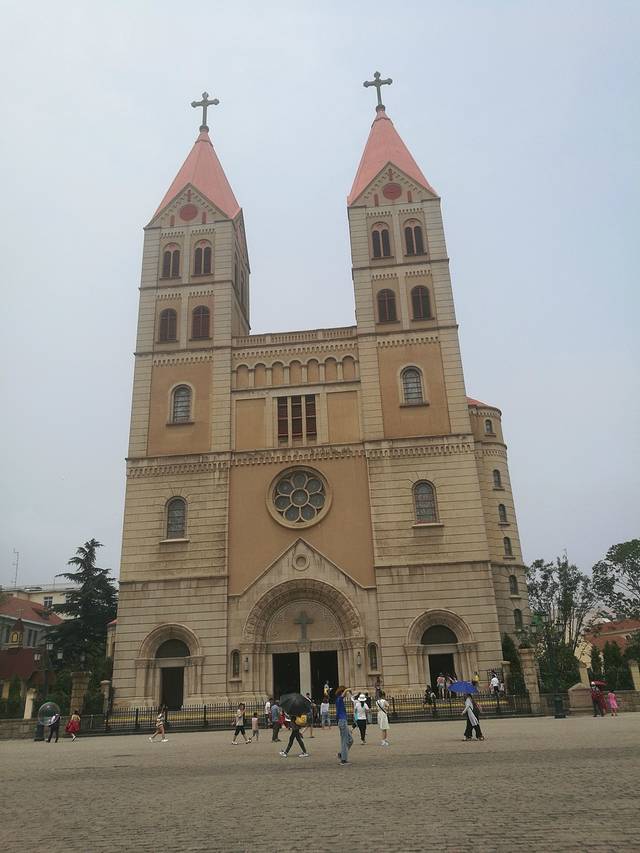 位于浙江路上的天主教堂建成于1934年,它拥有宏伟的尖塔,是青岛著名的西洋建筑。教堂表面雕有简洁优美的纹案,加上淡黄色的墙体,带一点粉色的红屋顶,色彩丰富而又甜美,吸引了无数拍婚纱照的新人。