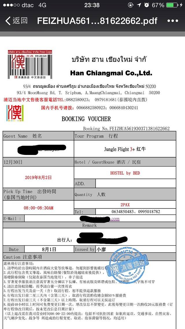 这是在某宝预订的丛林飞跃套餐,需要提早一天预订。内有包括:清迈古城内的酒店接送、丰富的午餐、会说中文的泰国教练。客服非常好,沟通很愉快,行程安排得妥妥当当的。比当地预订的便宜。