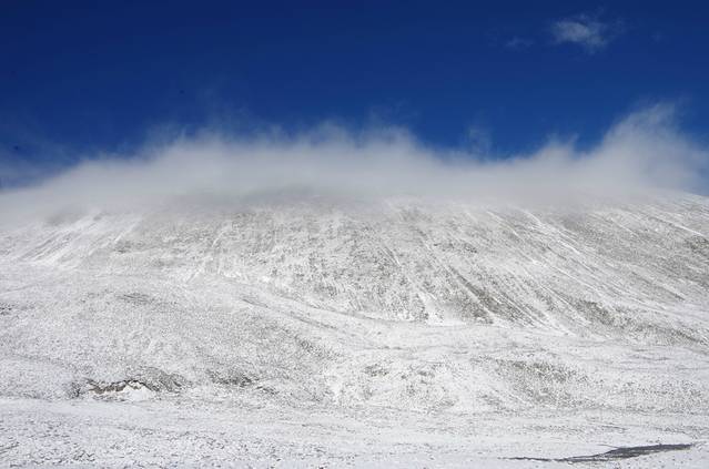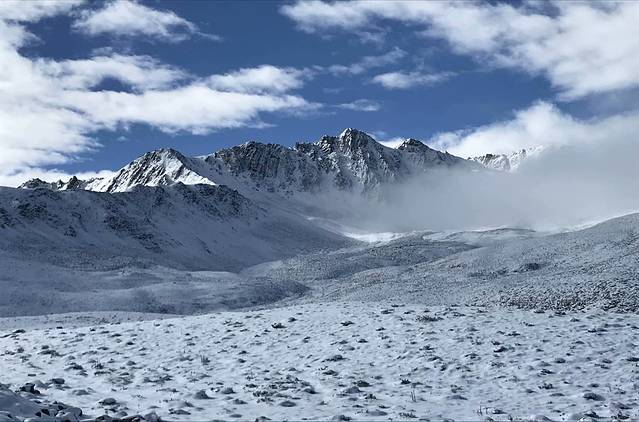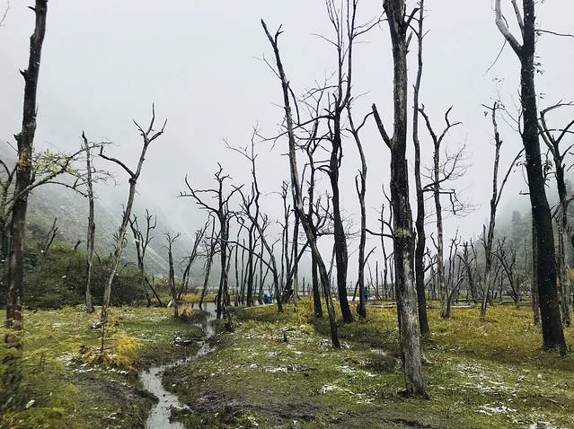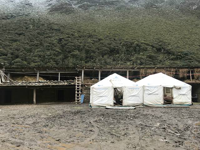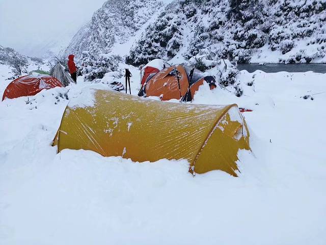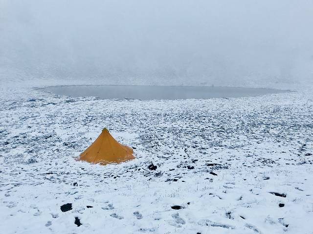终于到了营地,情况之惨烈超乎我的想象。由于大雪覆盖,营地很难找到一块平地,甚至找到一块没有积水的地方已经算万幸。另外,大雾+大雪使得冷噶措随近在只尺却无法相见,世界上最远的距离莫过于此吧……