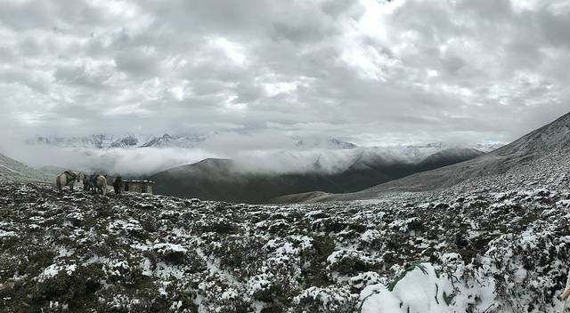 迷迷糊糊中,忽然听到外面有铃铛声,睁眼发现天已蒙蒙亮,把脑袋钻出帐篷,雪已经小了很多,但还在下。马帮开始陆陆续续集结上来,看来神医是要放弃4700营地组织大家下撤了。我穿好衣服,慢慢钻出帐篷,冷噶措可以勉强看到,但贡嘎依然被大雾笼罩。小心移步到各队员的帐篷询问大家情况,得知猴子和鱼头疼严重,华仔也很难受;豆豆状态最好,血氧86,;娜娜也还可以,精神状态不错;钥匙,呵呵,俺们的领队,血压高,心率高,血氧低;我测了一下我的,血氧只剩66了,心率105,不过几乎不头疼了;觉皇竟然数值和我一模一样,一下子让我放松很多,是不是经常健身的人都这样?