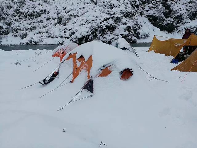 过了好一阵,雪似乎小了些,对讲机里传来“神医”通知,可以到离营地大约50米的一处白色大帐篷来吃饭。这才知道,我们队的其他队员,李姐、利哥、飞扬哥等人也在那里,据说条件还不错。我赶紧返回小金,并把信息传达给了觉皇。他说过去看下,这么高海拔估计那饭也没啥好吃的,不行就回来煮面吃。刚出去没五分钟,他便回来了。我说咋了?他说下雪下得根本看不到路,刚走出去20几米就有条小溪,差点一脚踩进去,就没再敢往前走。