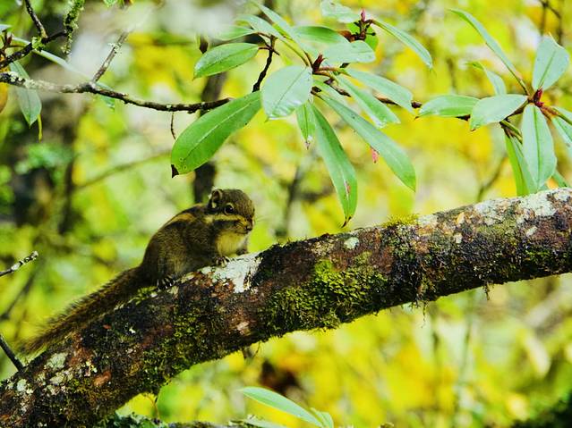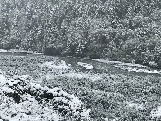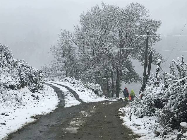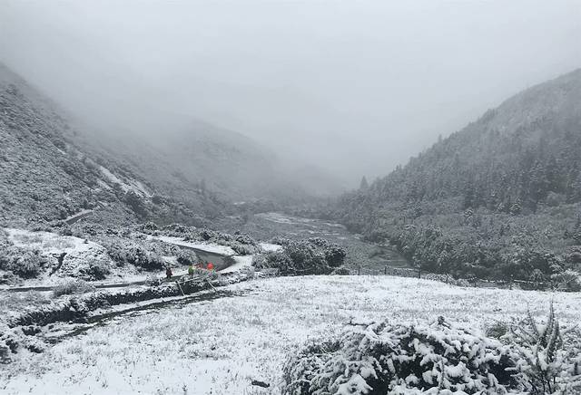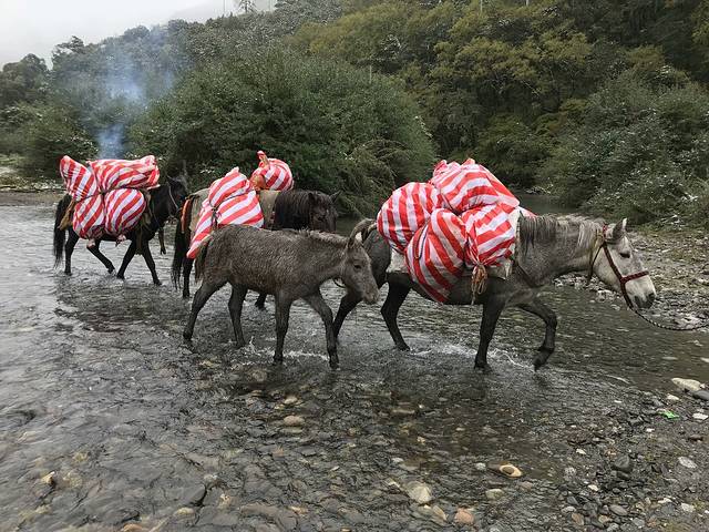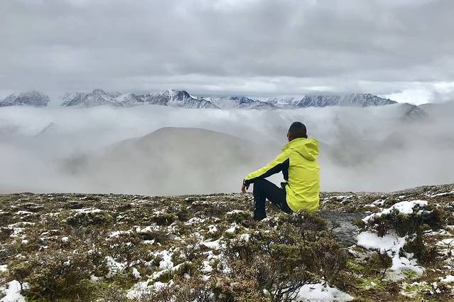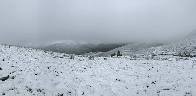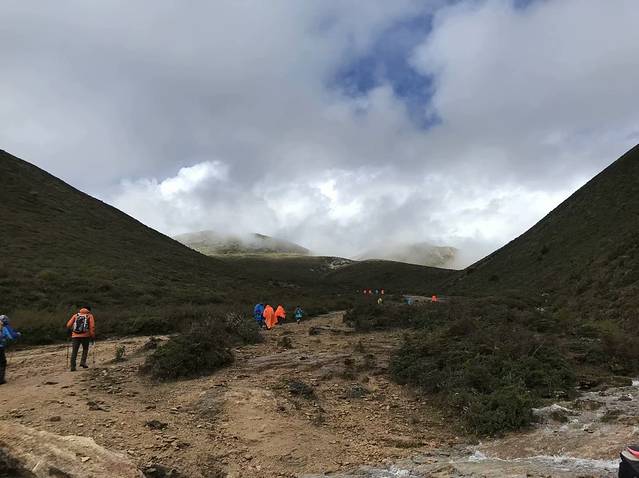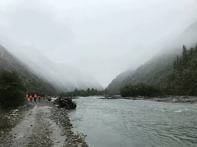 走了大约一个小时,随着海拔慢慢上升,我开始觉得每走一步都需要费好大劲,而且每走十几步就要停下来深呼吸,心率一直保持在110-120之间,但还好没有胸闷、头疼等症状。回头望去,玉龙西村已几近消失在远处的山坳中。队员战线开始拉长,三三两两分布在灌木丛中,马帮拉着我们的行李在崎岖的山路上叮叮当当……此时天空时而下雨,时而飘些雪花。一些村民开始骑着摩托或者带着马匹过来挨个询问:“要不要坐车?”或“要不要骑马?”但大家几乎拒绝了村民的好意,都想在这美丽的山谷间多走走。