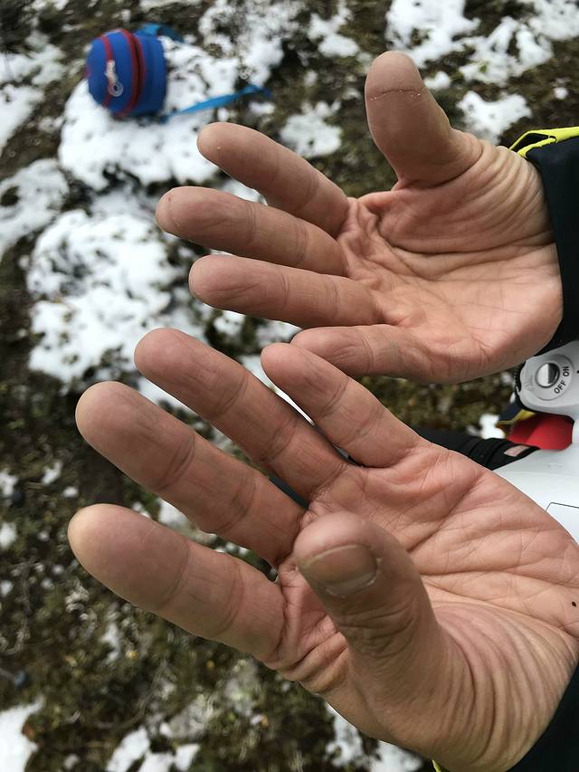 收拾行李并不比徒步轻松,因为要反复蹲起,搞不好就给自己一个头晕脑胀。觉皇没带手套,收行李时就把他冻得够呛,铁了心的是要下撤了。原本想留下的我,此时也变得底气不足。两个想法在我脑袋里乱撞,一个是“留得青山在,不怕没柴烧”,先保全自己,以后有机会再来;另一个就是,90%的困难都挺过来了,还差最后的一点坚持么?甘心么?