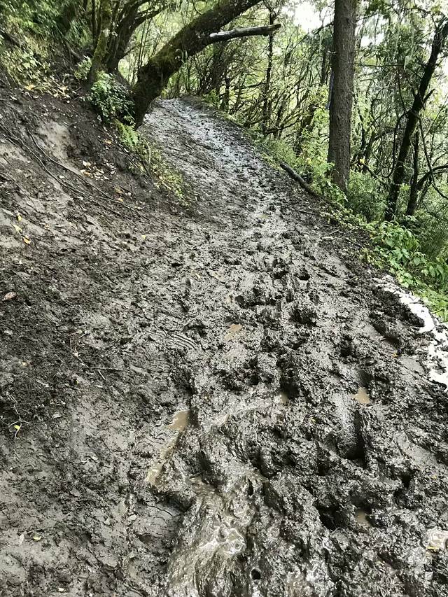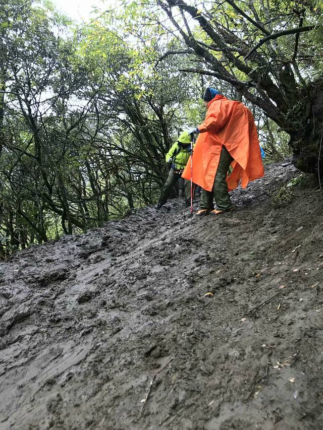 又经过约2个小时的“浴泥奋战”,终于抵达停车场。这段路绝大部分像是在原始森林中穿行,雨天虽然让路变得难走,但被雨水浸湿的植被颜色更加鲜亮。再加上远处时隐时现的雪山和在半山腰漂浮着一团一团的雾气,也就不难理解为啥直到我们5点多抵达停车场的时候,依然还有人往上走。