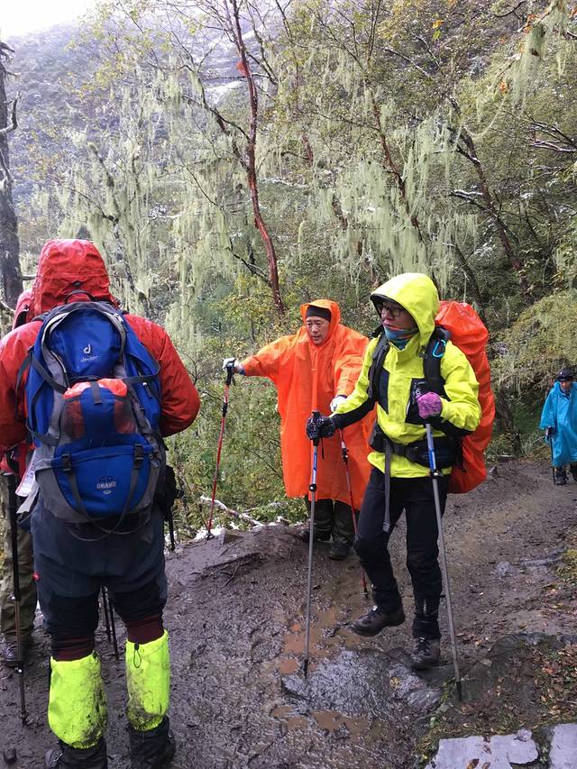 刚出发不久,之前淅淅沥沥的小雨忽然变成冰雹,给大家来了个下马威,很多队员开始掏雨衣,甚至换厚衣服。我当时只穿了一个速干衣+冲锋衣,感觉还行,除了心率偏高以外,其他一切正常,便继续前行,心里还想着早点到营地选个好地方拍照。