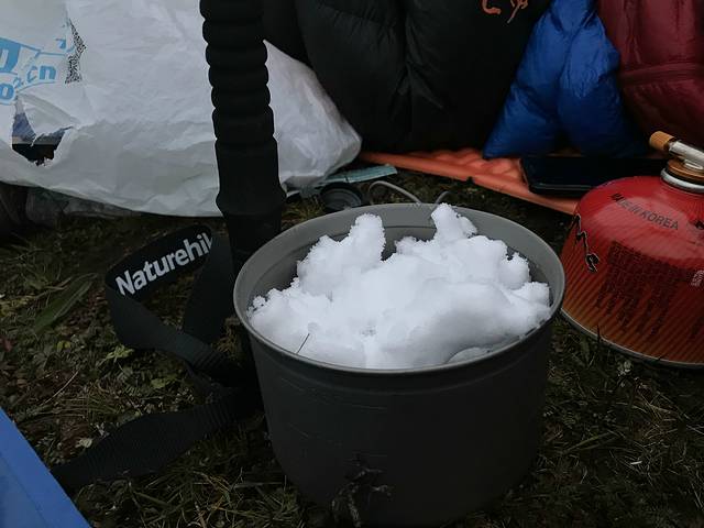 7点钟,大部分队友都已经走出帐篷,神医提着两壶开水挨个帐篷送温暖,并查看每个人的情况,然后召集津豫两领队钥匙和烟灰去大帐篷研究接下来的安排。我和觉皇开始准备早餐,煮牛奶燕麦粥,但发现两人此时一滴水也没有了,刚才神医送温暖时我俩看都没看就同时冒出来一句:“还是给更需要的人吧”。去湖边打水?这环境搞不好一脚踩水坑里弄湿鞋,好在雪有的是……