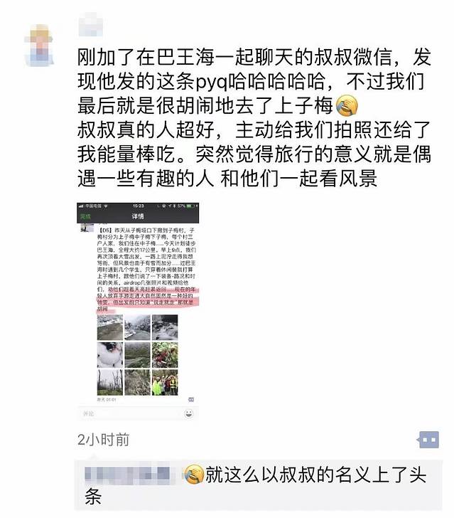 傍晚时分,在巴王海遇见的那个妹子还真的给我发了微信好友申请。相互了解得知,她们是成都某大学的学生,那天最终还是没听我们的劝告,继续向上到达了子梅村,而且还在凌晨去了子梅垭口看日出。虽然没有看到日出和贡嘎山,但上面的风景依然让他们兴奋不已;虽然弄得满身泥巴,还冻了一夜,也算不虚此行。后来我又开始唐僧,说如果喜欢户外运动,今后出发前还是要多做一些功课的,比如衣着啊,当地气候情况,出行前的保险啊什么的,这样才是对自己负责,也更是对家人负责。最后看到妹子的一条朋友圈让我很欣慰,我终于成为了梦寐以求的大叔。