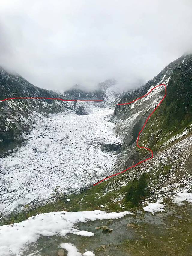 我们当天拍到的海螺沟实景,下面白色的并不完全是冰川,红线为利哥介绍他当年第一次来时冰川的高度