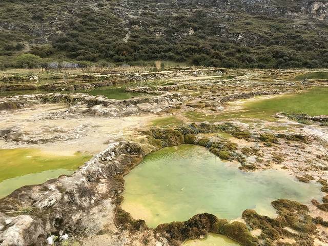 前往玉龙西村还需要2个多小时。由于近期连续下雨,路况相当泥泞,车灯也只能看到眼前五六米的距离,上下颠簸,七拐八绕,大家一言不发,只希望尽快平安抵达。司机似乎发觉了这点,打开了车上的音响,悠扬明快的藏文歌曲迅速缓解了大家的紧张情绪,也打开了话匣子……玉龙西村,东南面即贡嘎山。村中有一处长900多米,宽100余米的区域,由于含有较多钙、镁等离子的泉水不断涌出,长年累月在地表沉淀硬化形成众多大小不同、形态各异的五色池滩,即泉华滩。高处望去犹如一条玉龙横卧,这也是村名的由来。