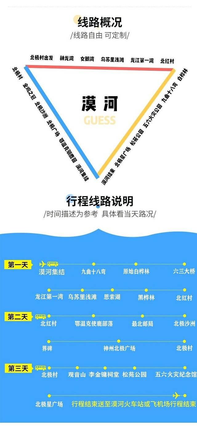 去漠河基本上就是自驾或者包车,我们都不会开车,所以就一边找住宿一边看大家的攻略和留言,搜到【北极村53度半国际青年旅舍】的时候,看下面有留言提到【一步旅行】,加了微信联系,因为对漠河的地址位置和游玩都没什么概念,所以问了很多,而且还经过了几次变化,但老板特别耐心而且给的建议都特别实际,很实诚,所以漠河的4天3晚的行程就都定了这里,1人650元包括包车、住宿和门票。附上大致行程,景点基本上是这些,大家可以看下路线。
