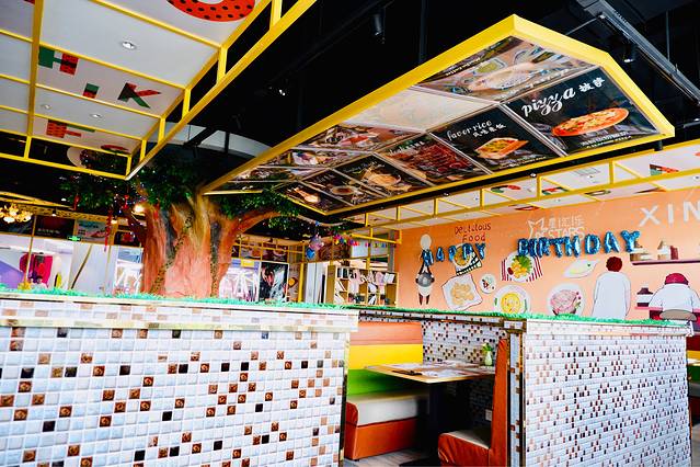 店里的装饰确实非常的小朋友,可爱的很,还有一颗大树在中间