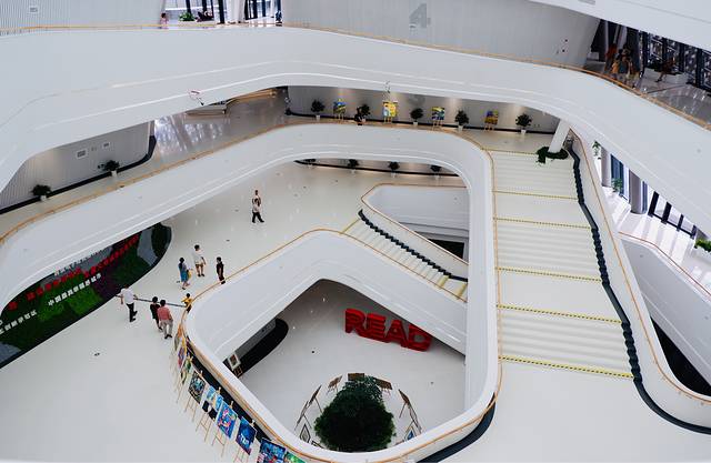 一共上下4层,白色的整体,白色的旋转楼梯是真的非常适合拍照哦,可以拍很大气很炫的照片,自然除了展示还有咖啡吧、文创书店、多功能厅等等。