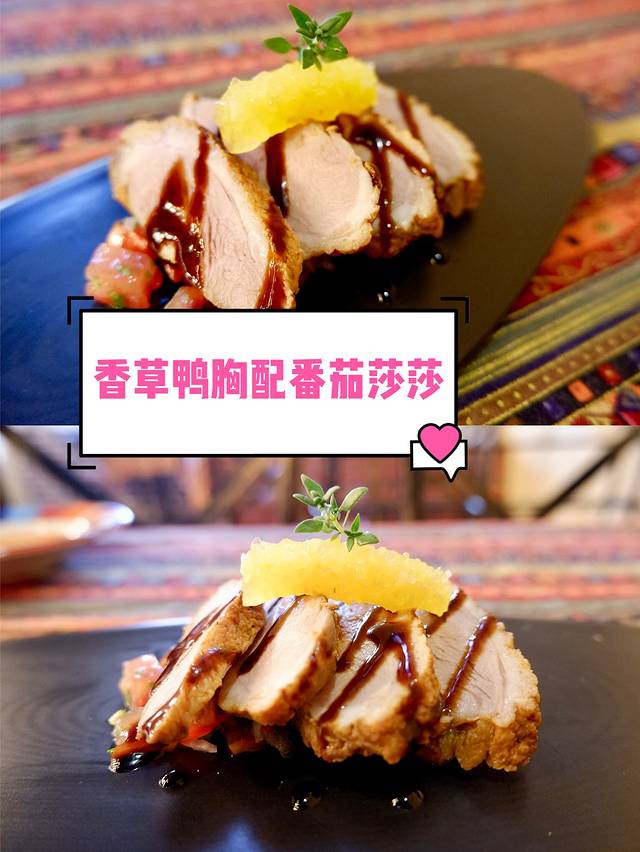 摆盘很精致,地下一层是番茄碎,上面整齐的排列着鸭胸肉,每一块的大小都比较匀称。