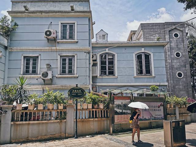 沙面岛映入我眼中的第一印象恐怕就是那莫兰迪色的建筑色彩,其次才是那极其富有欧陆风情的建筑风格,比如这个游览牌边上的淡蓝色建筑。