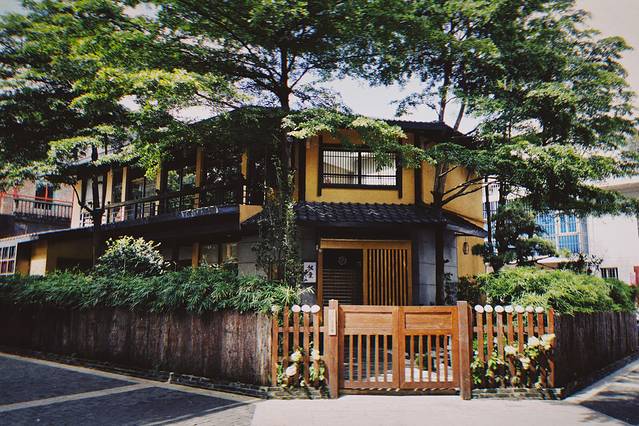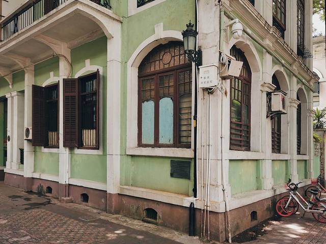 浅绿色的建筑配上朱红色的木窗,观感很和谐。
