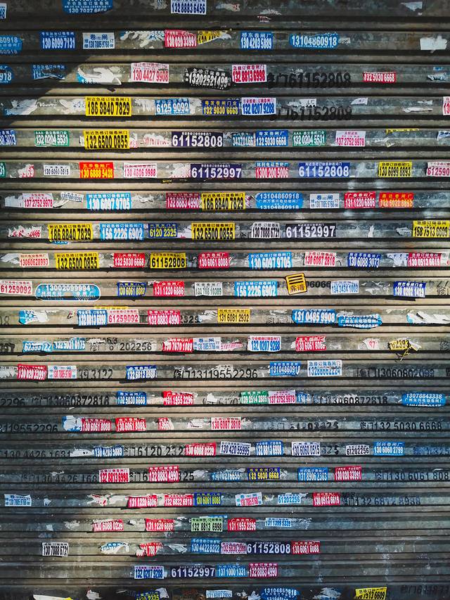 贴满各种颜色电话号码的卷帘门反而更像是一副现代艺术作品。