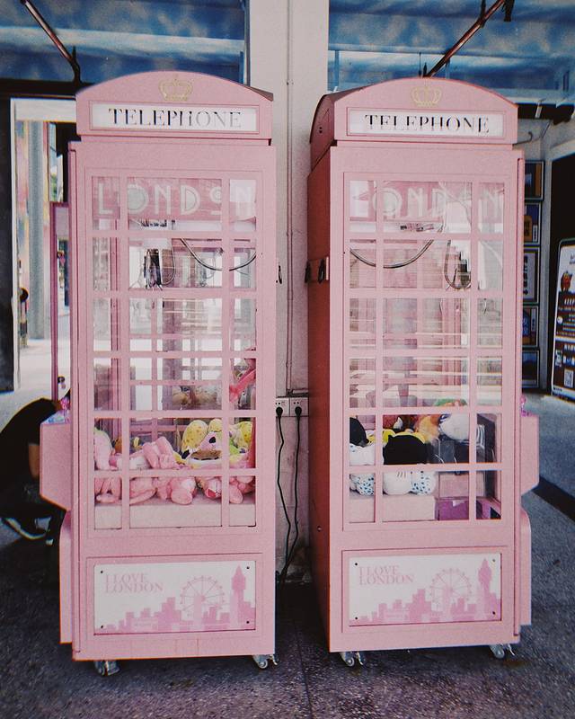 粉色电话亭样式的娃娃机,低饱和的颜色与环境很搭配。