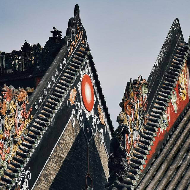 整个陈家祠的颜色风格为黑红,黑砖青瓦的建筑主体配上精雕细琢的朱红色雕像。