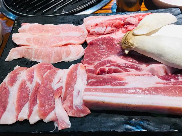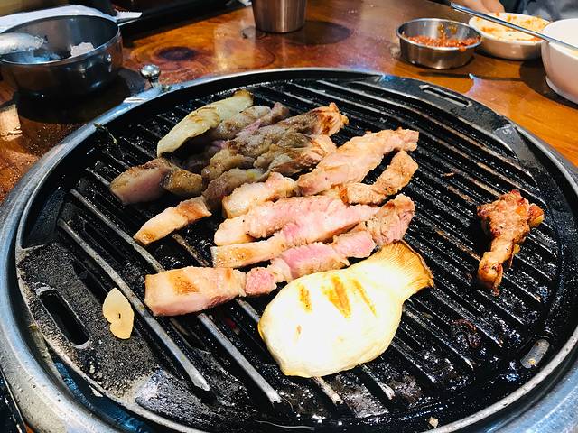 回酒店休整了一会儿,外出去吃韩国有名的烤黑猪肉。点了一个3-4人套餐,看着不多,肉貌似没有腌制过,全是原味的。烤熟后,蘸料、裹菜、拌饭,随你怎么吃。实话不如烤牛肉好吃啊!