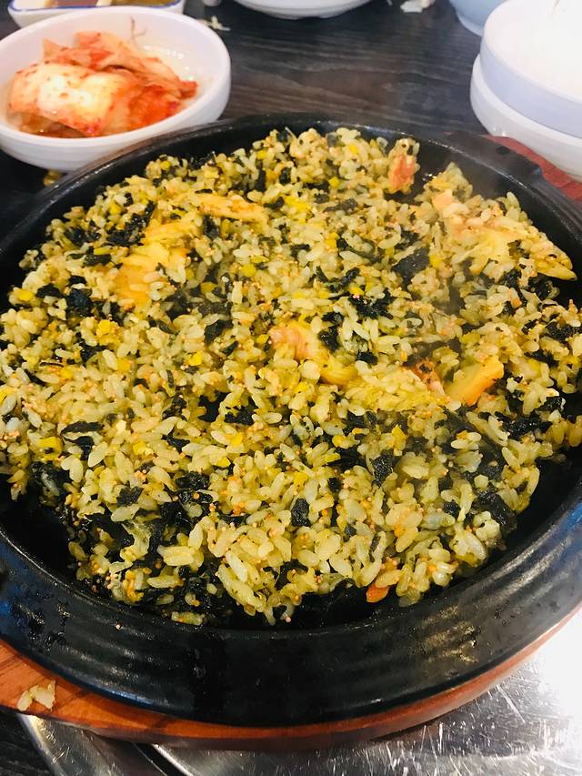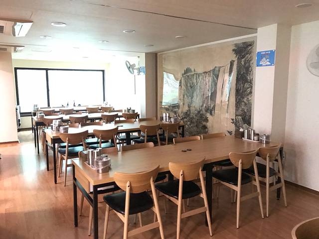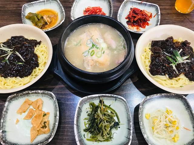 看韩剧的时候,经常看到男主在大口大口吃着黑漆麻乌的炸酱面,感觉好咸但是好好吃的样子,这次来韩国一定要亲口尝一尝。离酒店不远,在新罗免税店附近,看到这家“老奶奶炸酱面”好评颇高。店面不大,点了三份炸酱面和参鸡汤,一位干净利落的韩国大妈让我们先付款后迅速地把菜上全了。炸酱面拌开以后黑乎乎的,却是甜口儿的,酱里裹着土豆片洋葱碎,没有肉末,味道不错,娃子们吃得嘴都黑了。参鸡汤比首尔的浓稠,单喝汤有点儿腻,把鸡肚子里的米饭攉开,就着小菜吃好吃多了,有点炖鸡肉粥的感觉。