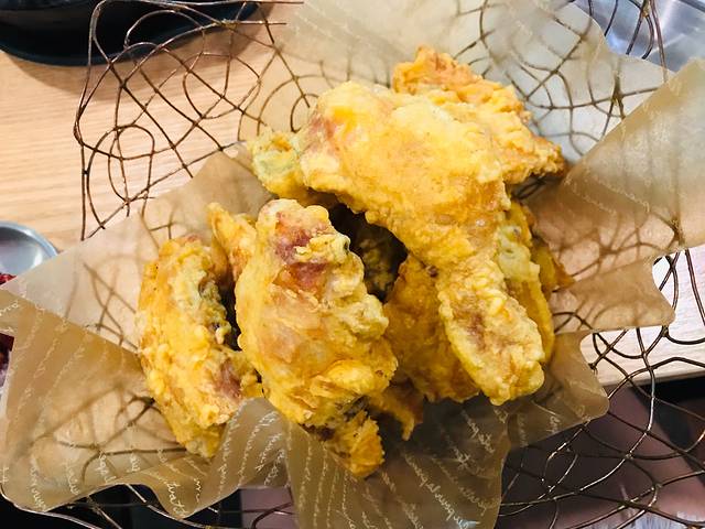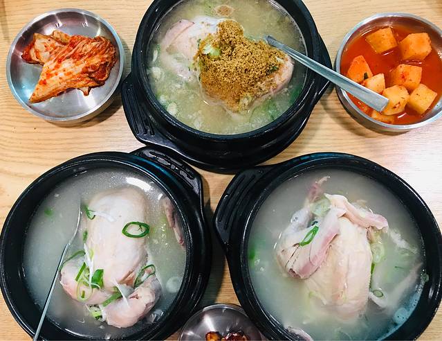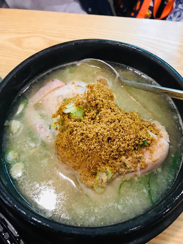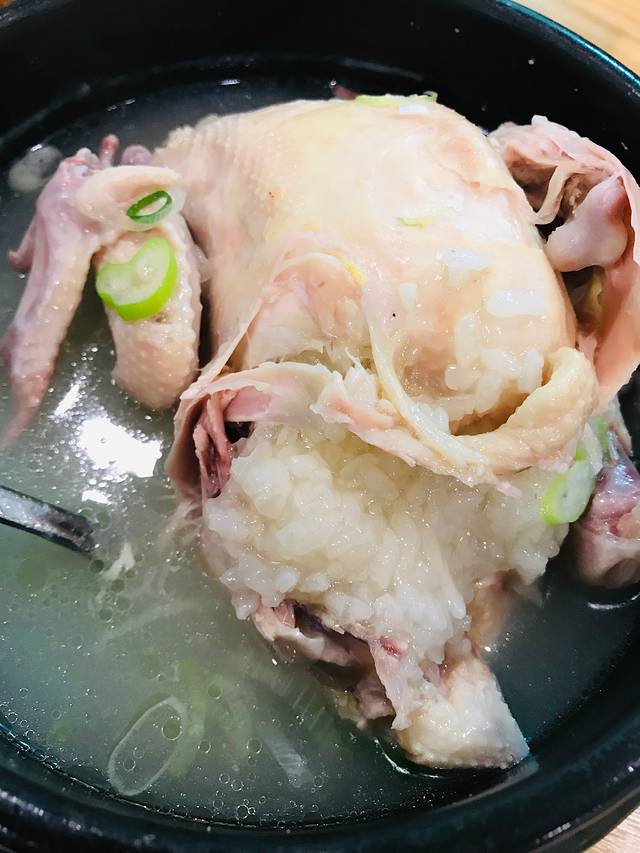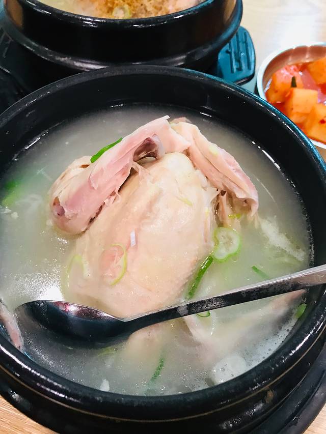 点了2份标准版参鸡汤、一份苏子参鸡汤和一份炸鸡,70000韩元。鸡汤不油腻,清香鲜美,鸡肚子里还有一大块米饭,感觉这么一碗,即便是个成年男子也够吃的了。对俩妈俩娃四位女士来讲,量简直太大了。我们喝了汤,吃了鸡翅鸡腿就败下阵来了。炸鸡恕我直言真心不好吃,谁让闺女不喝鸡汤呢?本来人家鸡汤店卖炸鸡就算是个捎带手儿嘛!