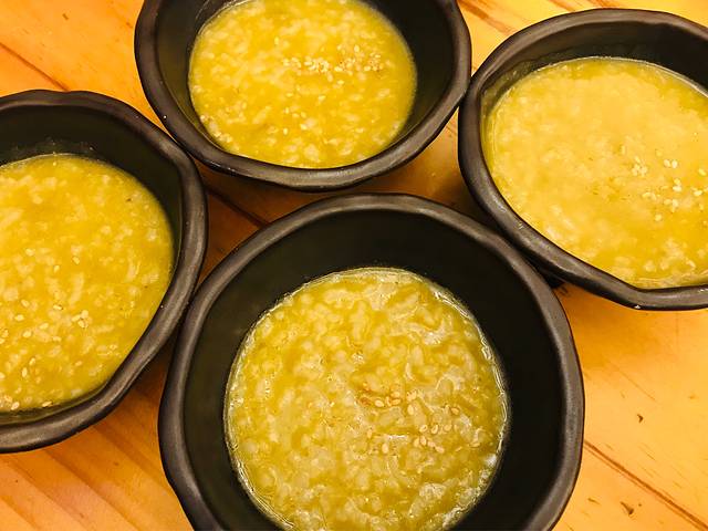 鲍鱼粥,以前知道这是鲍鱼内脏做的,所以一直不敢吃。这次看见粥不那么绿,硬着头皮尝了一口,味道竟然不错,没有什么异味,就是海鲜粥的感觉。