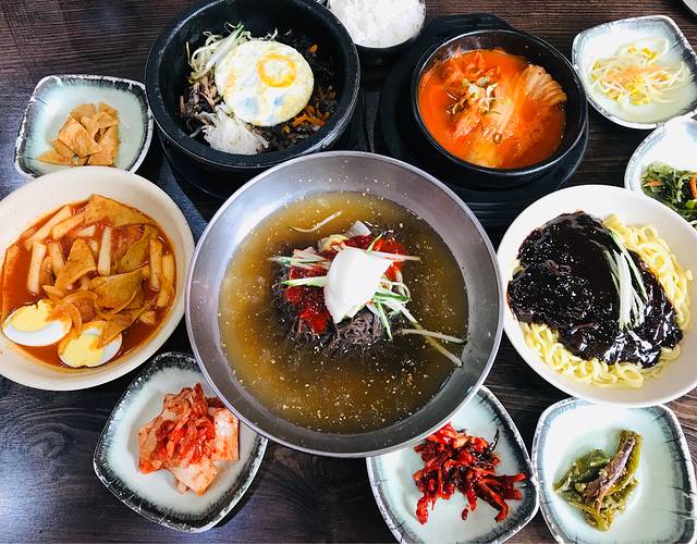 早餐还是选择了老奶奶炸酱面,因为娃子没吃够,并且她家的饭菜全乎,并不是仅有炸酱面。点了炸酱面、石锅拌饭、炒年糕、泡菜汤和冷面,每样都很好吃。