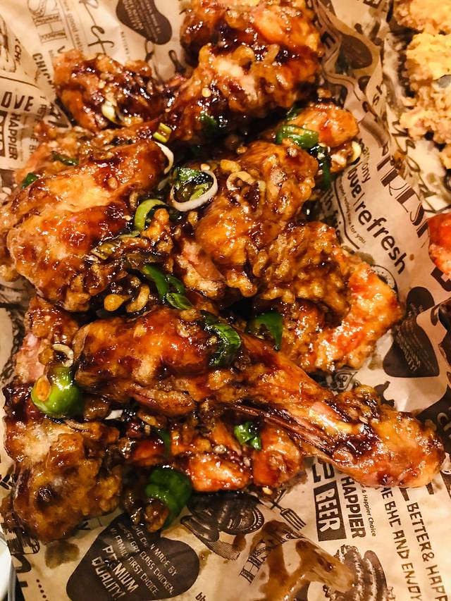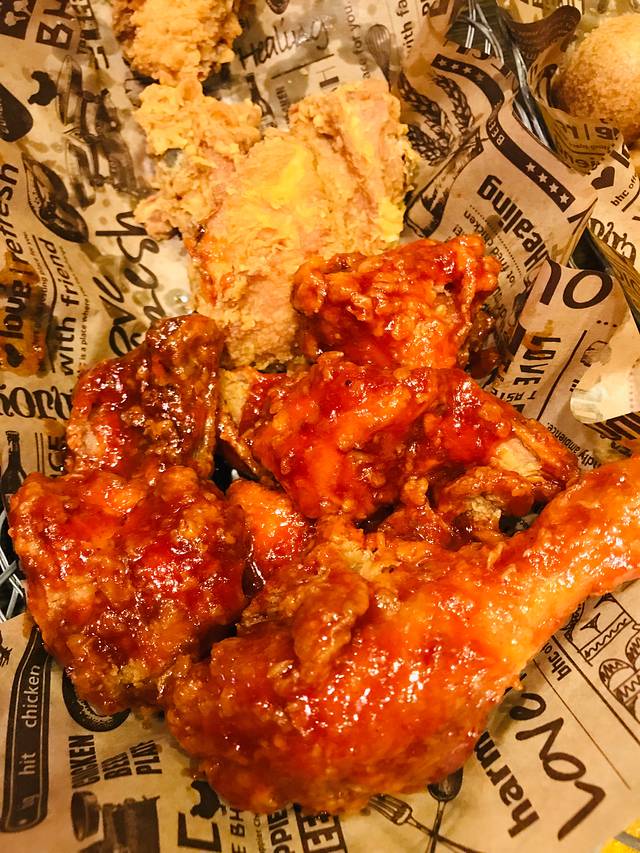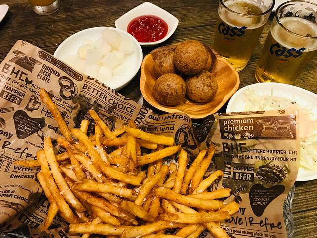 点了一份原味与甜辣双拼炸鸡,一份蒜香炸鸡,一份薯条、一份芝士球,两瓶啤酒。上菜后惊呆了,炸鸡的量简直太大了!一份大概有十余块,真是应该先吃、不够再点啊!
