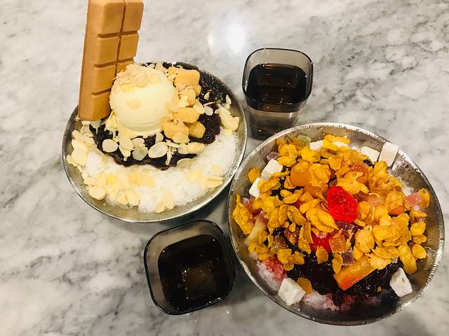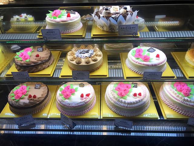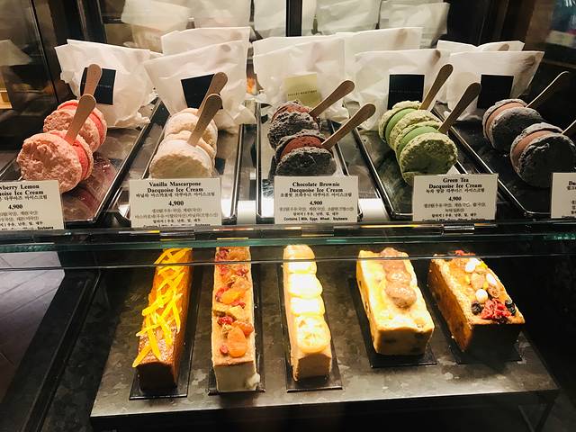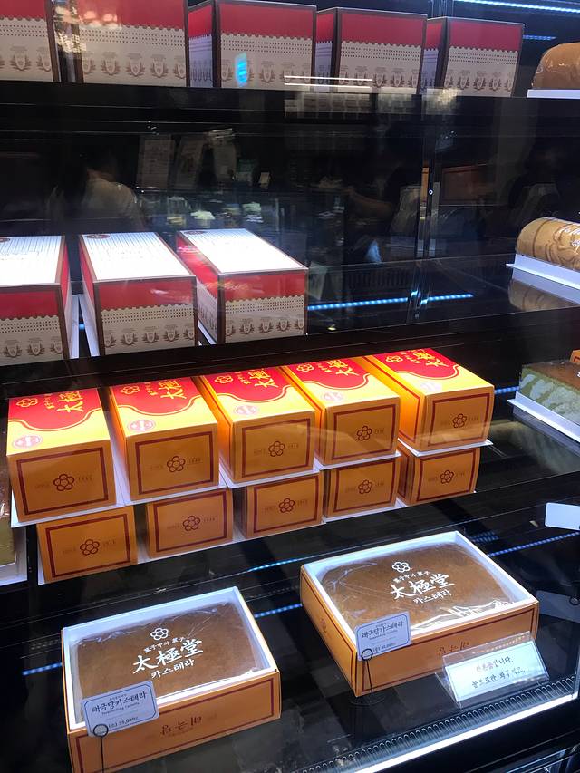吃完帝王蟹蹓跶回酒店,距离新罗酒店不远(基本上过了马路就能看到)的地方,看见太极堂这家店。看店名以为是一家药店,进去一看原来是一家韩式老牌面包甜品店。店面挺大的,蛋糕面包咖啡手伴都有。按照海报点了店里推荐的红豆冰沙和冰激凌华夫饼冰沙,看见实物时傻了眼,实物要比图片大很多(杯子是用来当参照物的),韩国人做生意的路数有点匪夷所思,庆幸没有点四例。四个人狂吃了一气,把重点部位吃完了,奶味十足红豆甜糯不腻,还是蛮好吃的,特别有小时候吃冰沙的感觉,但又是高配版。看见店里也有客人捧着这么大一碗吃得干干净净,我们是实在吃不下了,剩下不少。