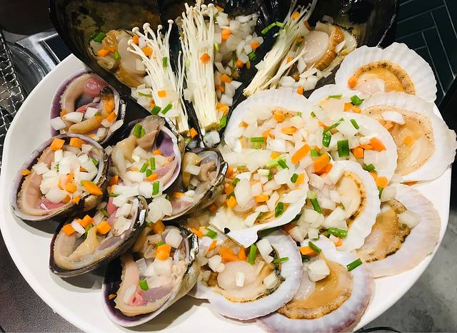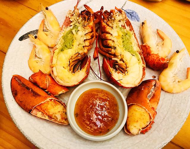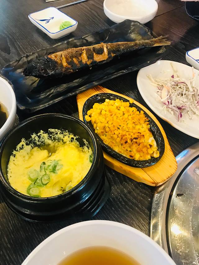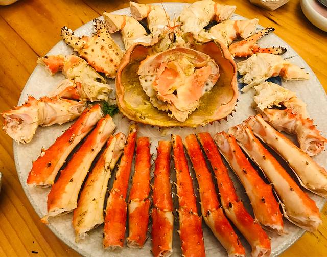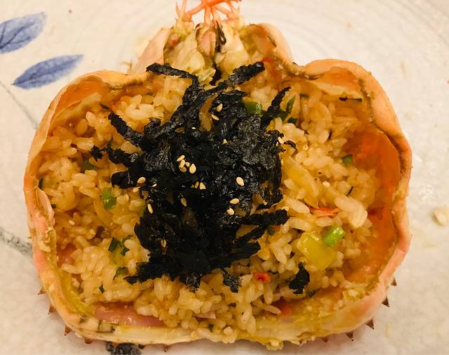 做法选择了一蟹两吃,清蒸蟹身和碳烤蟹脚,两种口味都很鲜美。点帝王蟹、长脚蟹都可以获赠海鲜拼盘,包括三文鱼比目鱼扇贝刺身、海螺、白虾青虾及甜烤带子;日常赠品貌似消费即得,包括烤秋刀鱼、芝士玉米、海带汤、蔬菜沙拉和鸡蛋羹,味道也很不错,份量足足的简直太不像赠品啦。最后小妹还力荐要尝尝蟹黄炒饭,本来已经吃不下了,一尝果然超级好吃😋,蟹子在嘴里爆开后越嚼越香,难以停嘴全吃光光啦。